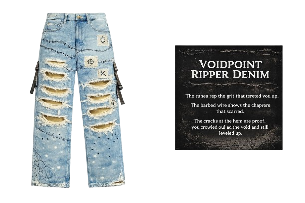 Built like armor for the end of the world. These jeans were “salvaged” from a burned-out denim mill and reworked by underground makers who stitch rebellion into everything they touch. The heavy slash distressing is meant to look like survivor scars—layered rips that expose the lighter underlay like bone under cracked concrete. The splatter wash isn’t random either: it’s the “ashfall” pattern, inspired by walking through a city after the lights went out.